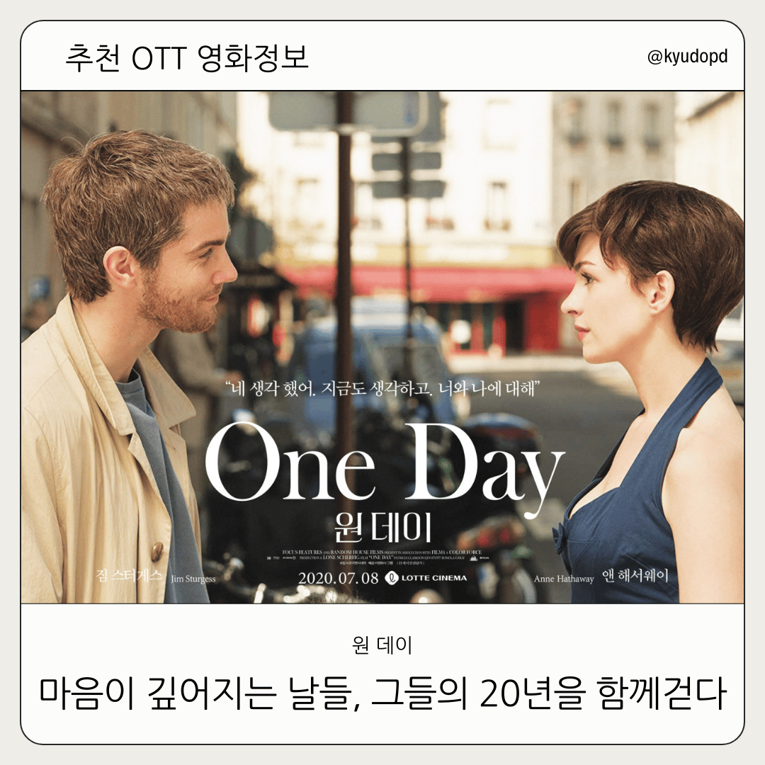 영화 원 데이는 1988년 7월 15일, 대학 졸업식 날 처음 만난 ‘엠마’와 ‘덱스터’의 관계를 매년 같은 날짜로 따라가는 독특한 형식의 로맨스다.